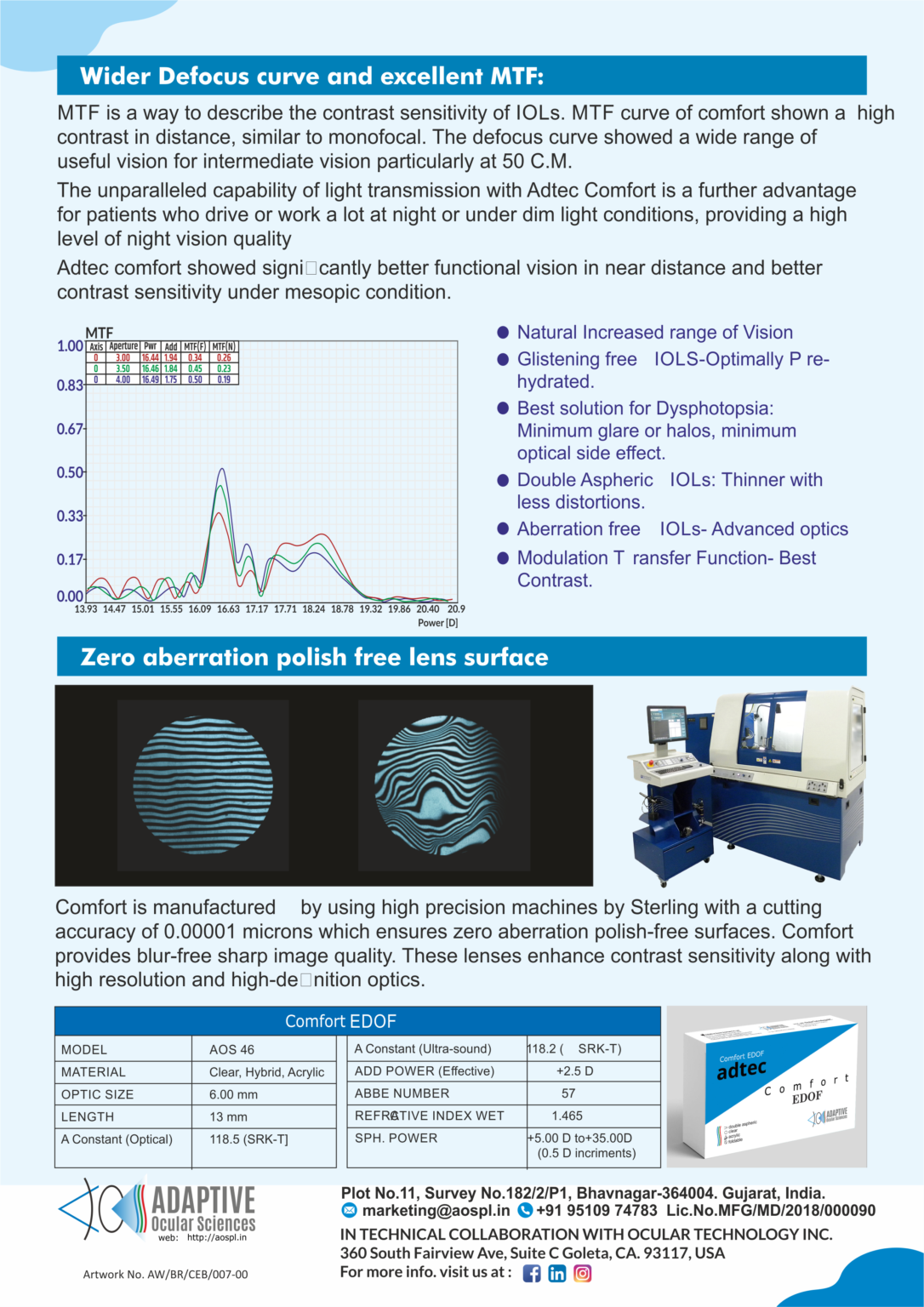 At Adaptive Ocular (AO), precision is our priority. We aim to enhance the specificity of labelling for the dioptric power of our Adtec IOLs, ensuring unparalleled accuracy in predicting IOL dioptric power for patients. Rest assured, each lens adheres to the tolerance limits outlined by ISO and ANSI standards, guaranteeing reliable performance.